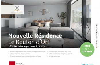 Découvrez maintenant la toute nouvelle résidence BOUTON D'OR du Projet CHAMP DU MOULIN, situé au c?ur du parc de 2 hectares, dans un cadre verdoyant tout en restant proche du centre. Elle se compose de magnifiques appartements à la fois stylés, fonctionnels, spacieux et durable. Agréable et lumineux, ils favoriseront votre confort grâce aux finitions de qualité. Ils vous offrent une belle terrasse avec vue sur le parc et un jardin pour les rez-de-chaussée. Système de ventilation D à double flux, vitrage à haut rendement, chaudière au gaz à condensation individuelle, ...Tout ceci vous garantit un label A+. Parking souterrain et cave (en supplément). Plans, cahier des charges et explications sur rendez-vous - 0474/57.91.01 ou 067/21.33.34 - www.immoparis.be- www.lechampdumoulin.be.